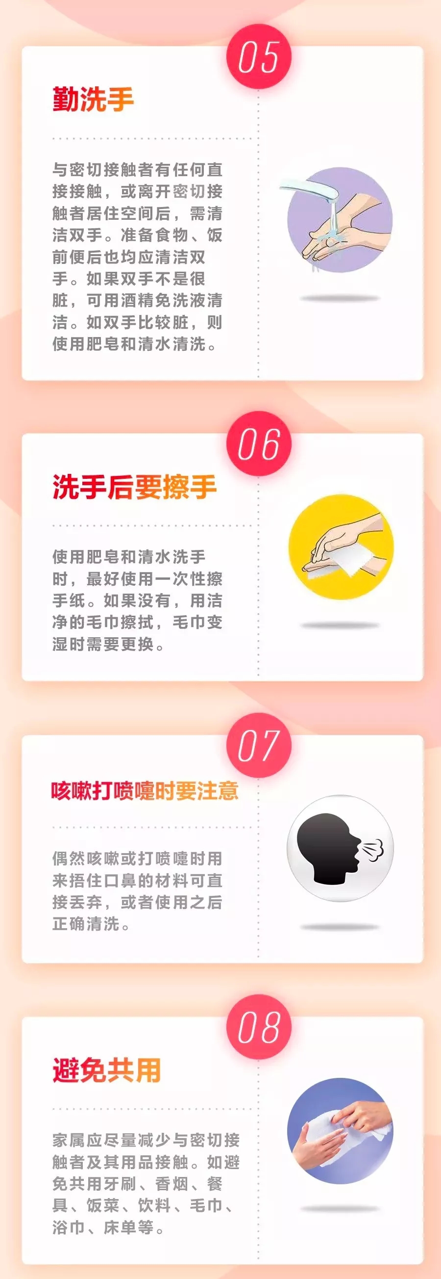 新型冠狀病毒感染的肺炎確診病例的密切接觸者,應從和病人接觸的最后一天起采取醫學觀察14天。在家中觀察期間,需與醫學觀察人員保持聯系,并需要了解病情觀察和護理要點,掌握家庭預防的洗手、通風、防護和消毒措施。