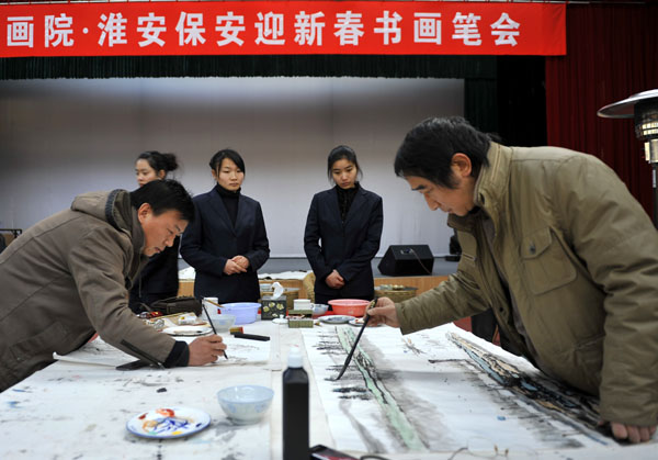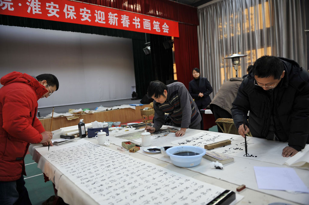 元月16日下午,由淮安書畫院和總公司聯(lián)合舉辦的“迎新春書畫筆會”活動在公司活動中心舉行。公司總經(jīng)理婁伯翱、副總經(jīng)理王克、徐文剛和各部門負責(zé)人蒞臨活動現(xiàn)場,部分保安隊伍和押運隊伍中的書畫愛好者到現(xiàn)場觀摩學(xué)習(xí)。會上,書畫們齊集一堂,創(chuàng)作了一幅幅書畫精品,彰顯了保安文化特色,贏得了在場觀摩者們的贊賞與好評。