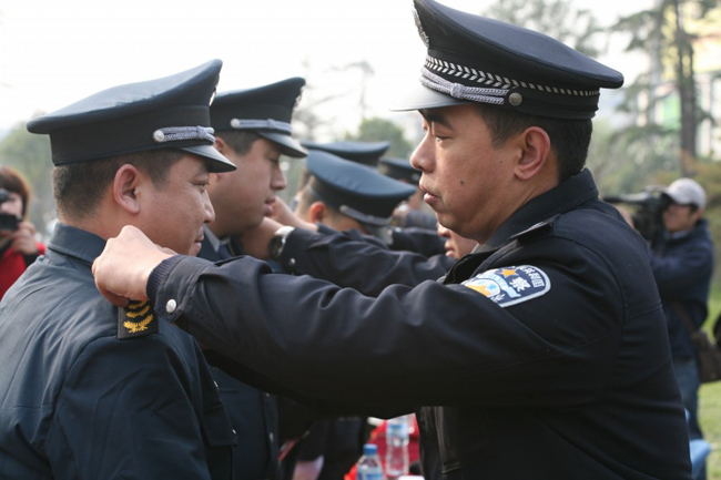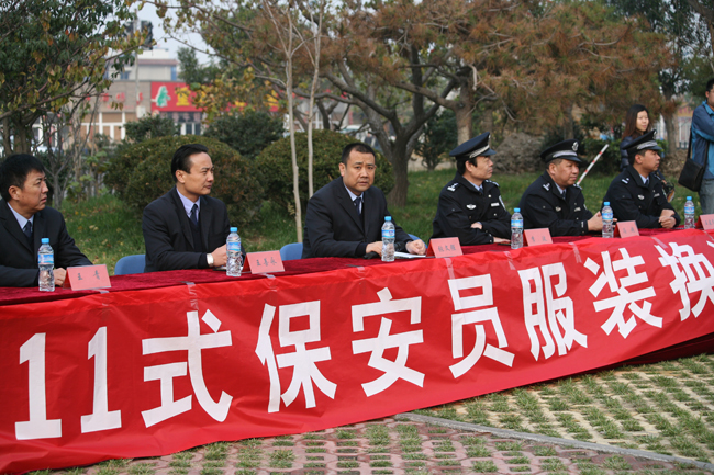 11月22日上午9點30分,公司保安員換新裝儀式在龍都廣場舉行,儀式現場,首批100余名保安員穿上了2011式服裝。公司領導及天橋分局治安大隊保安管理科領導為保安員授銜。隨后,全體身著新式保安制服的保安員進行了隊列演練;最后,公司領導強調:在換裝后保安隊伍將按照公安部要求,加強保安隊伍建設,努力建設一支素質過硬、形象良好、服務規范、群眾滿意的保安隊伍,也希望我們全體保安員要以這次換裝為契機,進一步增強榮譽感、責任感和使命感,外樹形象、內增素質,推動安保工作再上新臺階。在社會治安工作中發揮重要作用。