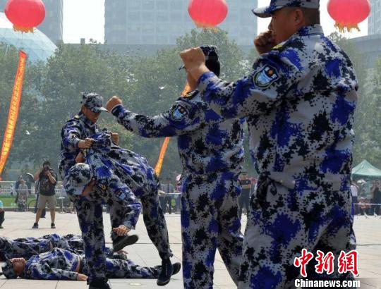 來自石家莊市19個專業(yè)保安服務公司的600名保安員當日在河北省博物館廣場在進行了一場現(xiàn)場演練,“硬氣功”、“搏擊術”、“鋼叉術”、“槍擊術”以及武裝押運反搶劫等10個項目輪番上演,引得觀者如云,叫好聲不絕。