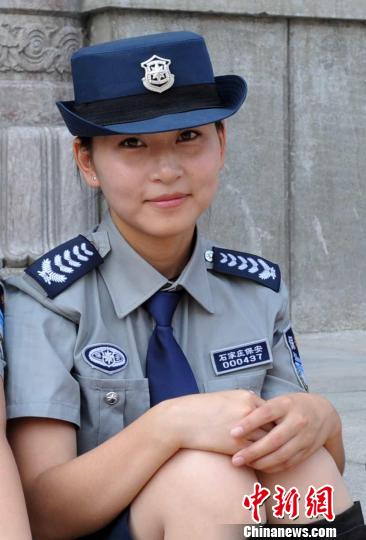 當天演練活動中,一位身著新式保安服的女保安在一旁休息。翟羽佳攝