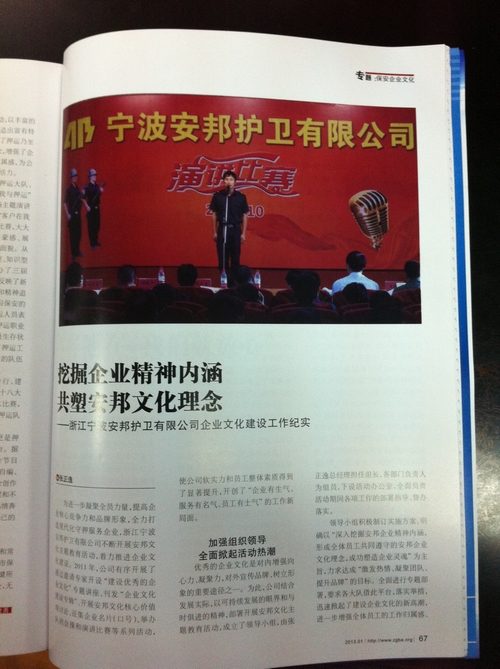 2012年,寧波安邦護衛有限公司通過開設“建設優秀的企業文化”專題講座、刊發“企業文化建設專輯”、組織安邦文化核心價值觀討論、征集企業名片(口號)、舉辦隊列會操和演講比賽等活動,著力推進企業文化建設,顯著提升公司軟實力、核心競爭力和員工整體素質,取得了一定成效。2013年1月,今年第1期《中國保安》(總第279期)雜志 “保安企業文化”專題欄目刊登《挖掘企業精神內涵,共塑安邦文化理念——浙江寧波安邦護衛有限公司企業文化建設工作紀實》,對寧波安邦護衛有限公司企業文化建設情況進行了報道,進一步擴大了公司的行業知名度和社會影響力。