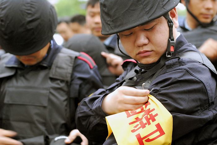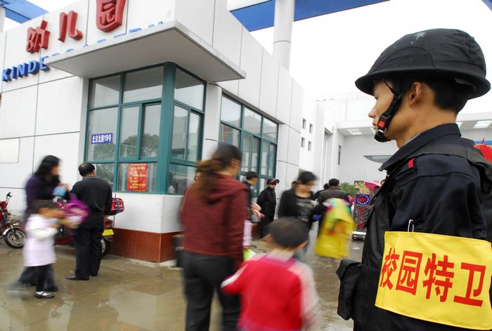 2010年5月5日早晨6時許,全副武裝的校園特衛(wèi)人員整裝待發(fā)。自當日起,江蘇省淮安市首批46名配備鋼盔、防刺服、防割手套、防暴膠棒、滅火槍、催淚器等防護裝備的專職校園特衛(wèi)人員開始進駐市直23所中小學(xué)和幼兒園,守護校園平安。這些人員都是從全市保安隊伍中精選出來的骨干,年齡在35歲以下,大都有部隊服役的經(jīng)歷,身體素質(zhì)和政治素質(zhì)較好,且受過專業(yè)訓(xùn)練。