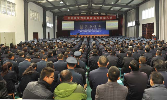 會議內容和安排一切從簡,有四項議程,一是播放年度總結PPT文件,二是宣讀表彰人員名單,三是部門遞交責任狀,最后總經理婁伯翱講話。押運大隊市區押運員和駐各縣隊員代表;機關各部門人員以及各分公司員工代表近700人參加了會議。