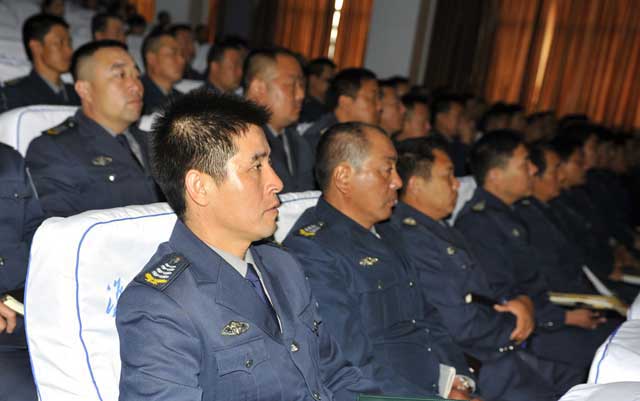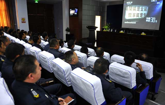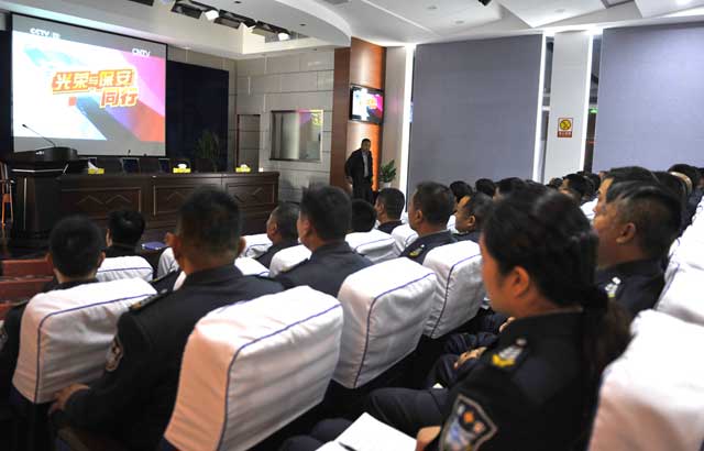 2014年10月27日上午,總公司周一早例會結束后,與會人員在報告廳一起觀看了《光榮與保安同行》電視專題片。