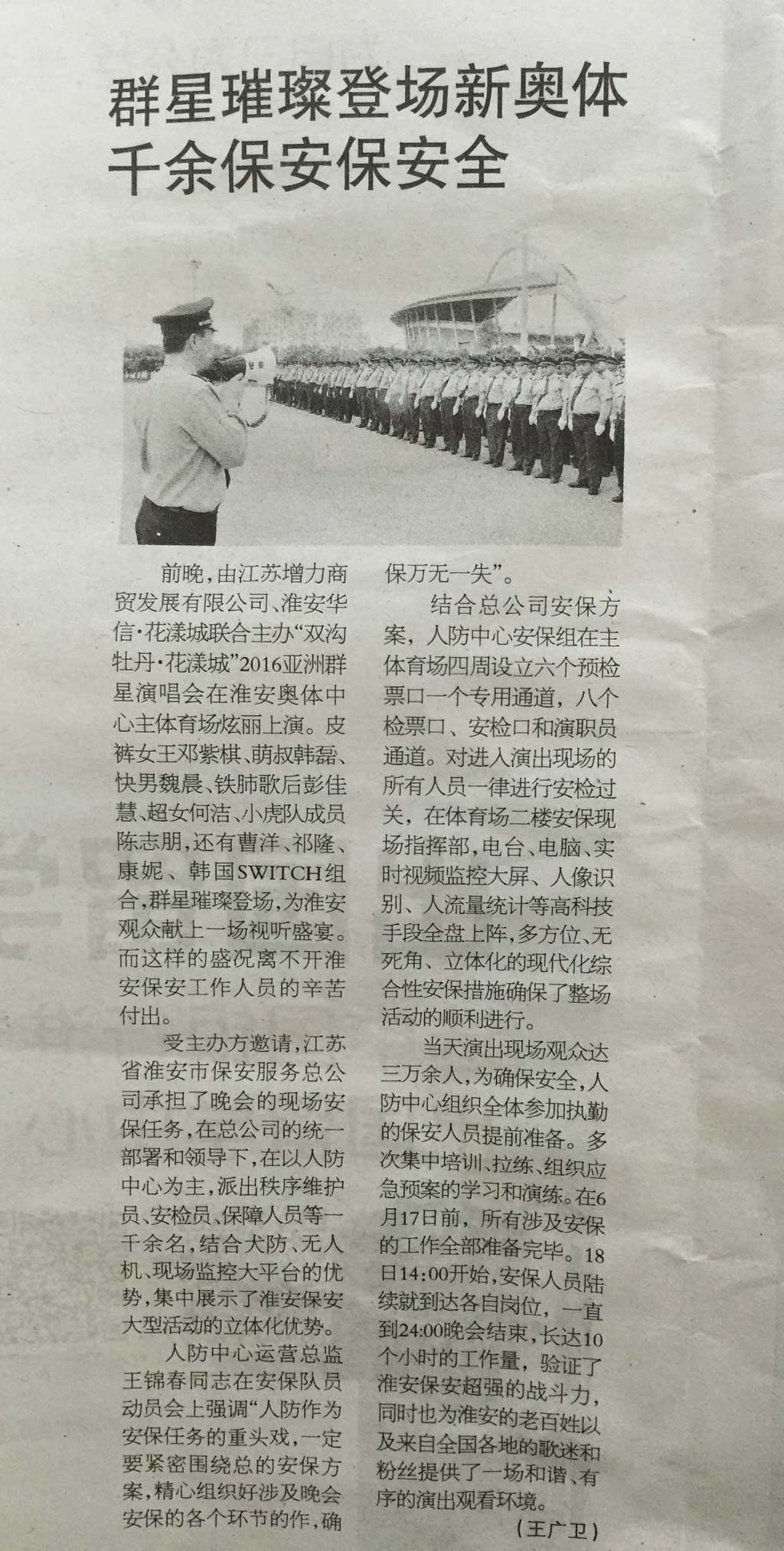 由江蘇增力商貿發(fā)展有限公司、淮安華信·花漾城聯(lián)合主辦“雙溝牡丹·花漾城”2016亞洲群星演唱會于6月18日晚上在淮安奧體中心主體育場炫麗上演。受主辦方邀請,我公司承擔了晚會的現(xiàn)場安保任務。當天現(xiàn)場觀眾達三萬余人,為確保安全,在總公司的統(tǒng)一部署和領導下,派出了秩序維護員、安檢員、保障人員等一千余名的強大陣容,同時結合犬防、無人機、現(xiàn)場監(jiān)控大屏等優(yōu)勢,集中展示了淮安保安大型活動的綜合立體化優(yōu)勢和超強的戰(zhàn)斗力,受到了社會各界的充分肯定和高度評價,并于2016年6月21日在《淮海晚報》上以“群星璀璨登場新奧體,千余保安保安全”為題予以宣傳報道。
