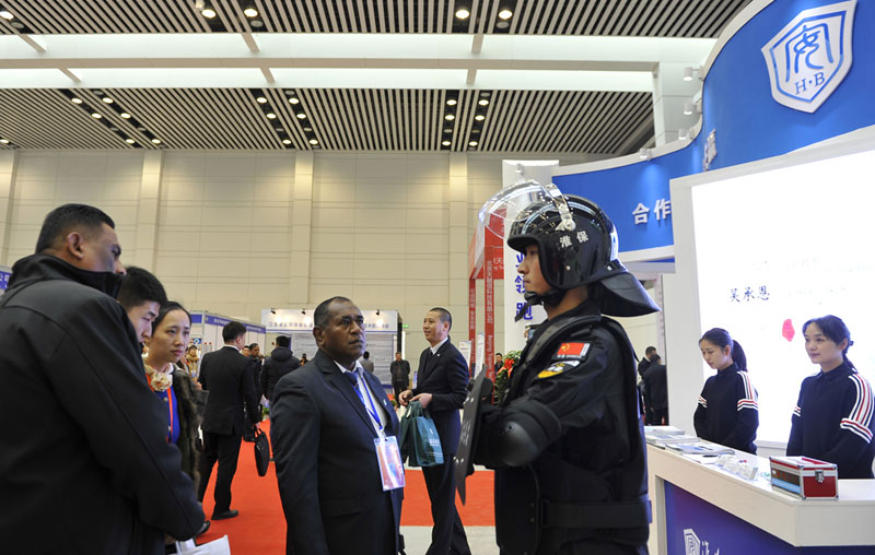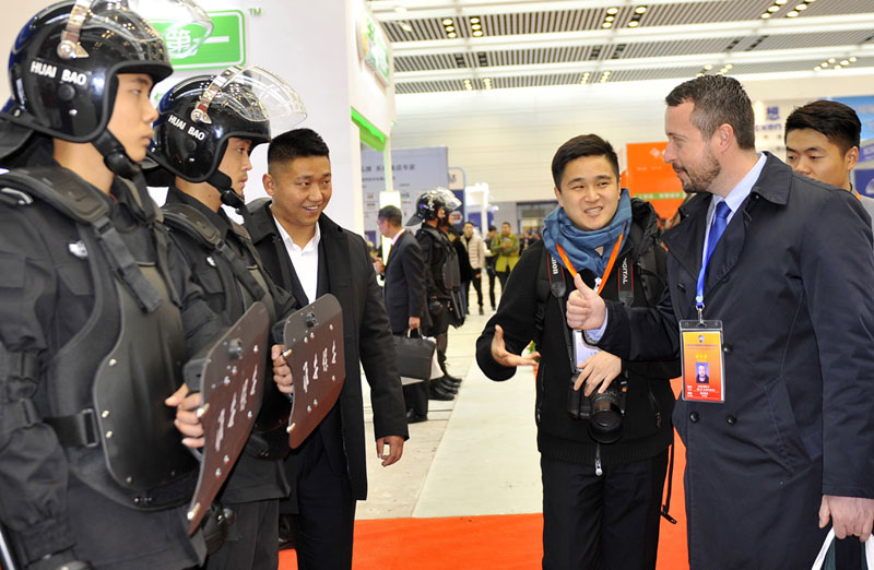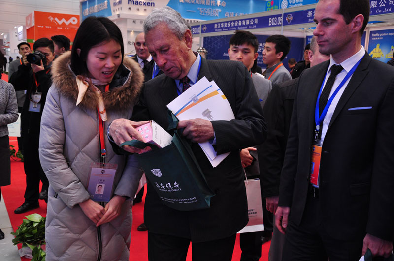 2017年12月11日,第三屆“連云港論壇”警用裝備和公共安全產(chǎn)品博覽會現(xiàn)場,淮安保安展臺吸引很多中外嘉賓駐足參觀,工作人員向嘉賓一一介紹公司展示的業(yè)務和項目情況。